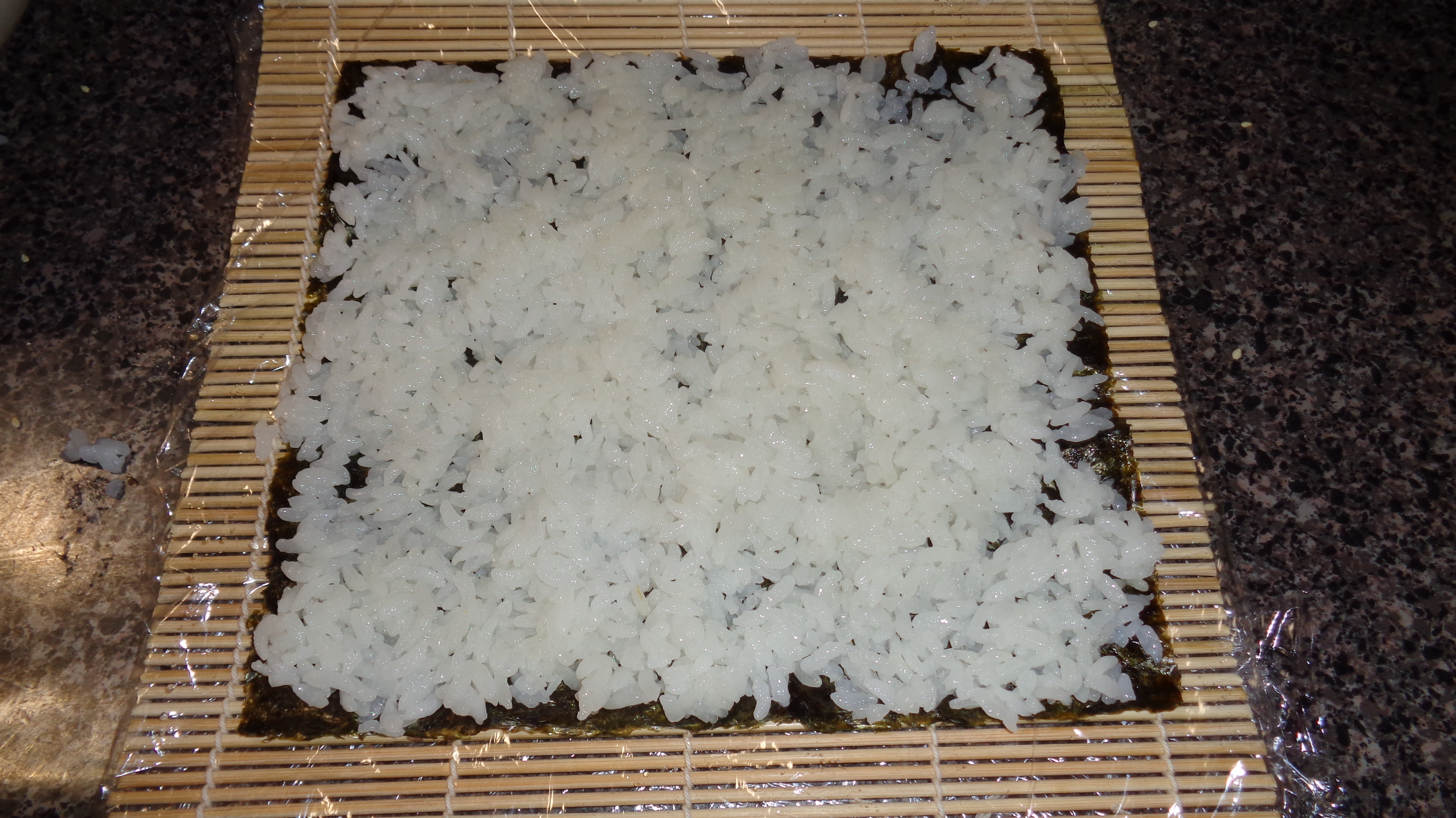 Spoon rice onto Nori sheet, making sure to spread thinly.